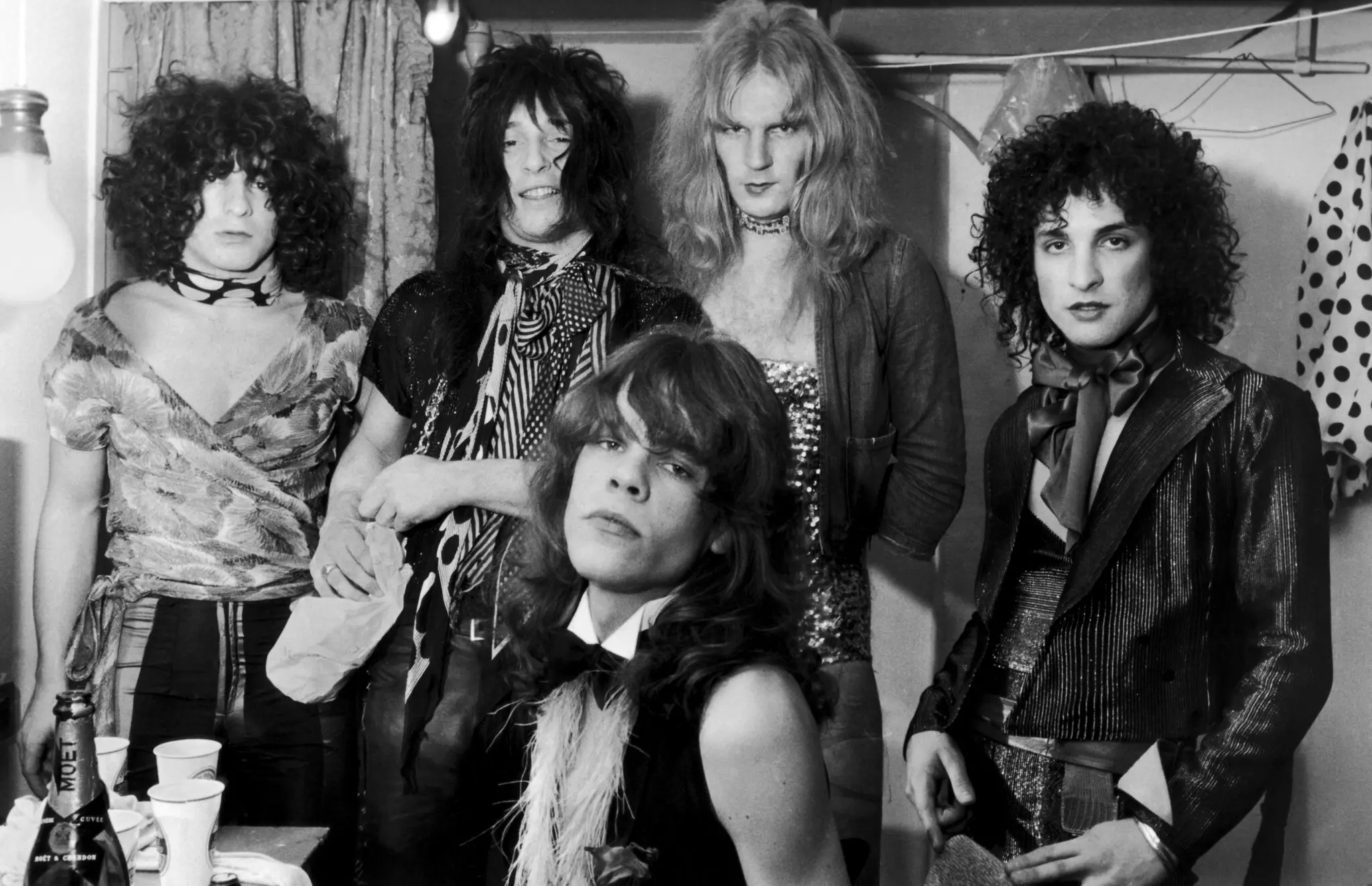 Sr. Johansen, nos bastidores com o New York Dolls em 1972, da esquerda para a direita: Billy Murcia, Johnny Thunders, Arthur Kane e Sylvain Sylvain.Crédito...P. Felix/Daily Express — Arquivo Hulton, via Getty Images