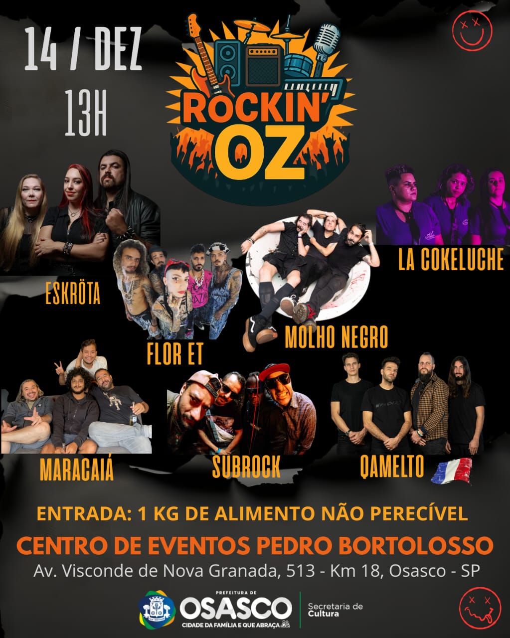 A Prefeitura de Osasco, através da Secretaria de Cultura, tem o prazer de anunciar o ROCKIN’ OZ, o evento que promete ser o último e maior festival de rock da cidade em 2025, celebrando a força da cena musical local e trazendo grandes nomes do cenário nacional e internacional. O festival, que carrega o espírito solidário, acontecerá no dia 14 de dezembro e terá entrada mediante a doação de 1kg de alimento não perecível.