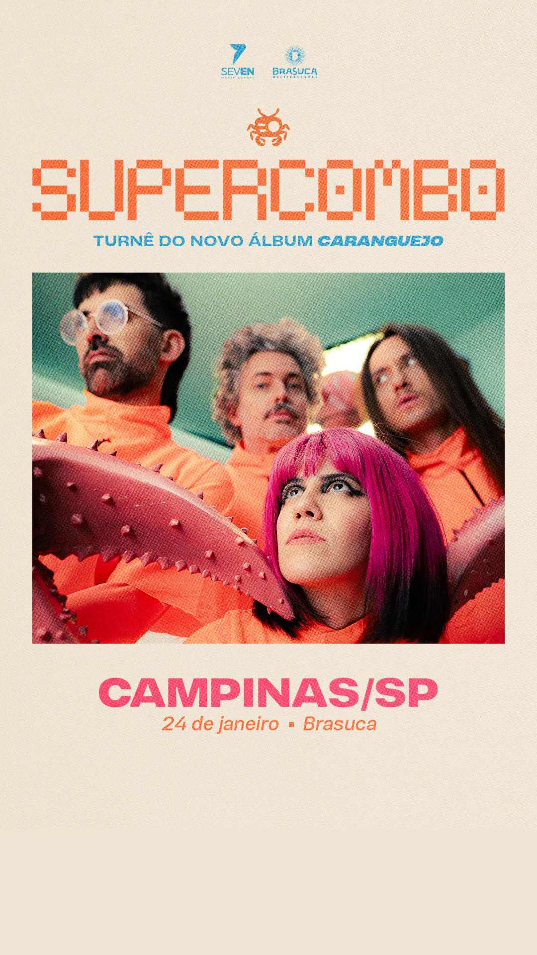 A Supercombo se prepara para o segundo show de 2026 com a turnê do álbum Caranguejo, após brilhar como atração principal da inédita edição Verão do tradicional Polifonia. A próxima parada, já neste sábado (24/01), é Campinas/SP, no Brasuca, a casa mais multicultural da cidade paulista.