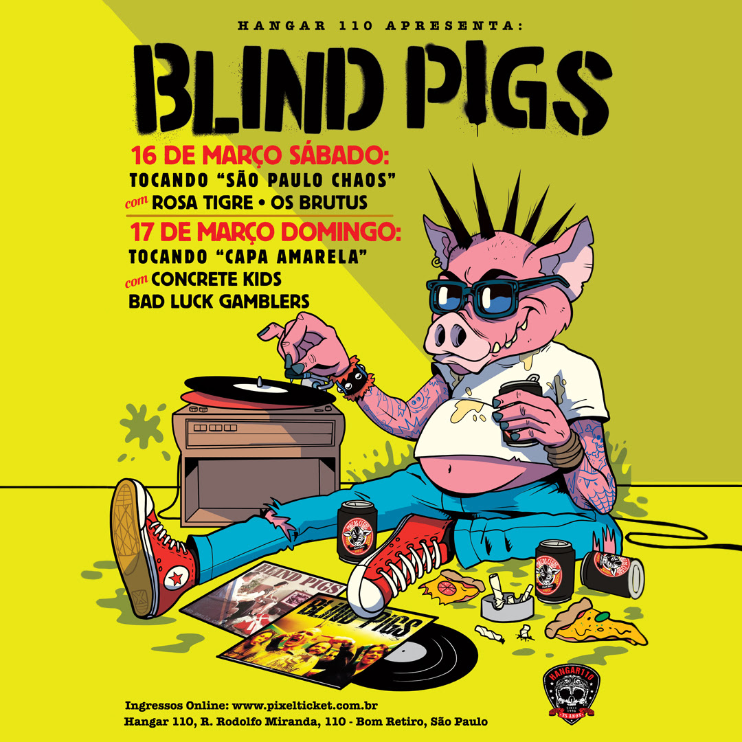 Depois de uma turnê de 30 anos com apresentações memoráveis na capital paulista, em lugares como o Carioca Club e o Tendal da Lapa lotados de fãs, a banda punk rock Blind Pigs volta aos palcos da cidade de São Paulo. Desta vez, os shows acontecem no Hangar 110, espaço que consagrou o Blind Pigs no início dos anos 2000, como um dos principais nomes do estilo. O reencontro com a casa, que às vezes precisava marcar duas datas no final de semana para dar conta do público da banda, vem também em dose dupla, porém com duas noites diferentes. No primeiro dia, marcado para 16 de março, a banda tocará na íntegra o álbum de estreia “São Paulo Chaos”, além de alguns dos principais hits do grupo para completar o setlist. Já na noite seguinte, 17, o disco contemplado será o “Blind Pigs”, mais conhecido por ‘capa amarela’.