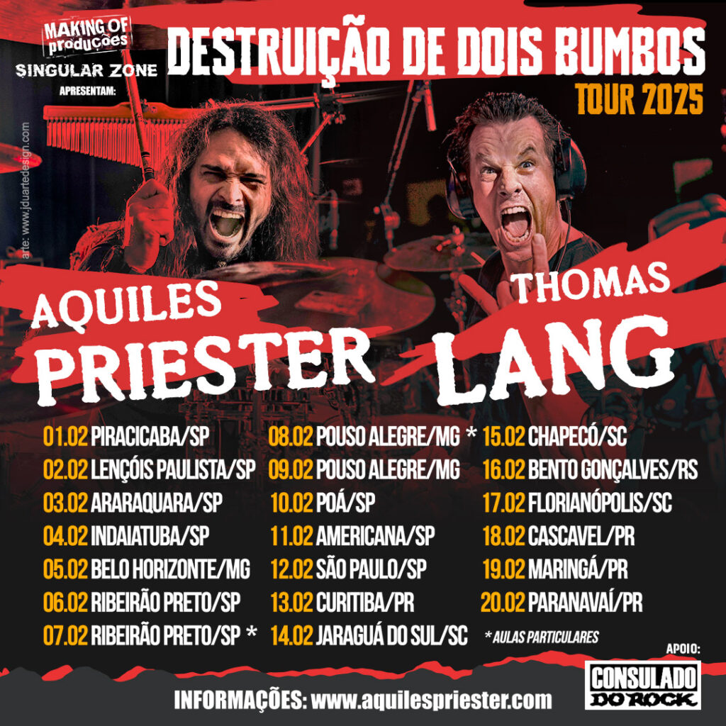 Aquiles Priester e Thomas Lang, amigos de longa data e respeitados mundialmente na comunidade da bateria pelos anos de trabalho duro e de inspiração, unirão forças para uma turnê exclusiva pelo Brasil. Este evento é uma oportunidade única de ver esses mestres das baquetas ao vivo, compartilhando seu talento e paixão pela música.