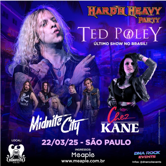 A tradicional Hard ‘n’ Heavy Party, criada pelo proprietário da Animal Records, Carlos Chiaroni, em meados de junho de 2000 com o intuito de resgatar os “anos dourados” do hard rock e do heavy metal do final dos anos 80, terá mais uma edição pra lá de especial em 2025. Com produção da DNA Rock Events, a Hard ‘n’ Heavy Party promete agitar novamente o palco do Manifesto Bar (SP) no dia 22 de março (sábado) com a estreia dos ingleses do Midnite City no Brasil, o retorno da vocalista inglesa Chez Kane e o sempre bem recebido Ted Poley (Danger Danger, Tokyo Motor Fist, Bone Machine e outros).