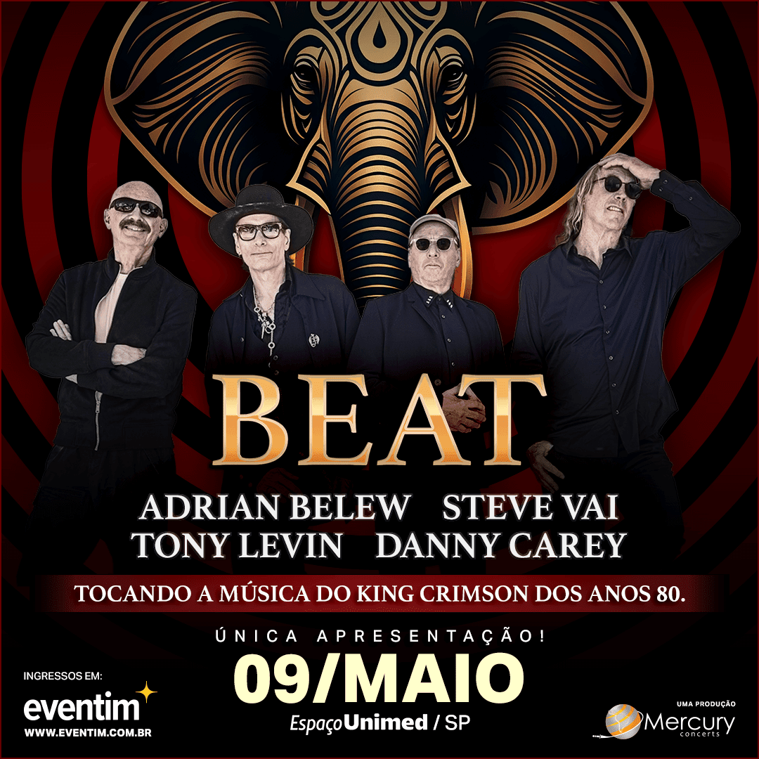 Os membros do King Crimson, ADRIAN BELEW e TONY LEVIN, se uniram ao virtuoso guitarrista STEVE VAI e a DANNY CAREY, explosivo baterista do Tool, para criar o supergrupo BEAT que leva aos palcos uma reinterpretação criativa de três dos mais icônicos e influentes álbuns do KING CRIMSON lançados nos anos 80: Discipline (1981), Beat (1982) e Three Of Perfect Pair (1984).