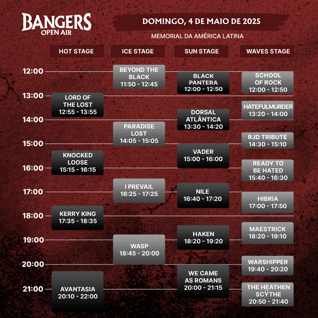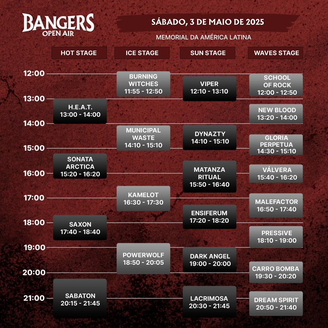 Bangers Open Air, o seu festival internacional no Brasil, que acontecerá nos dias 2 (Warm-Up), 3 e 4 de maio, no Memorial da América Latina (SP), acaba de anunciar a grade oficial de horários de apresentação das bandas para a edição deste ano do festival. Agora, com os horários revelados, é hora do público se programar para aproveitar ao máximo os 3 dias de evento com muita música e experiências inovadoras como “signing session” com os artistas e a feira medieval, entre tantas outras.