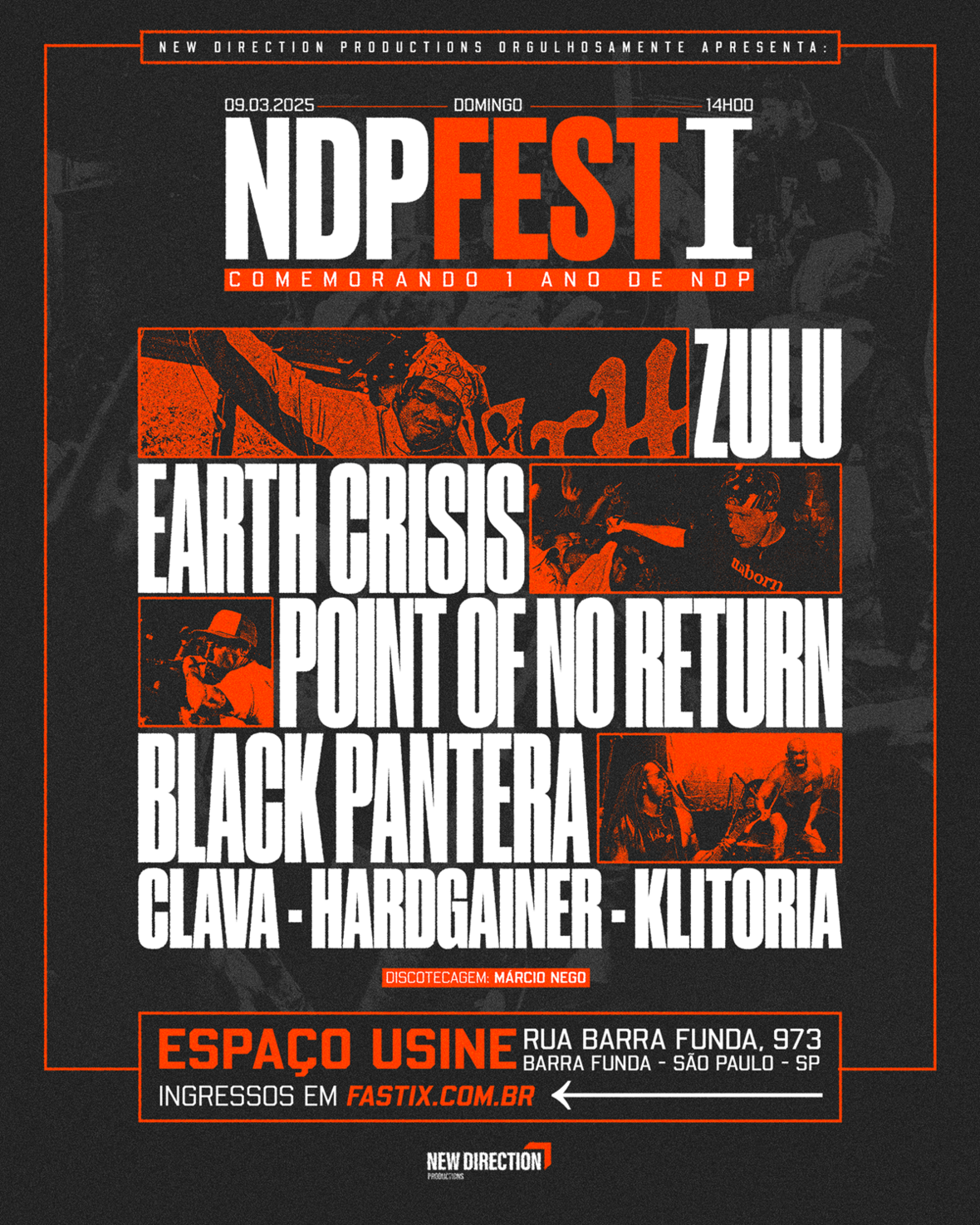 Ingressos: https://fastix.com.br/events/ndp-fest-earth-crisis-eua-e-point-of-no-return-sp-em-sao-paulo