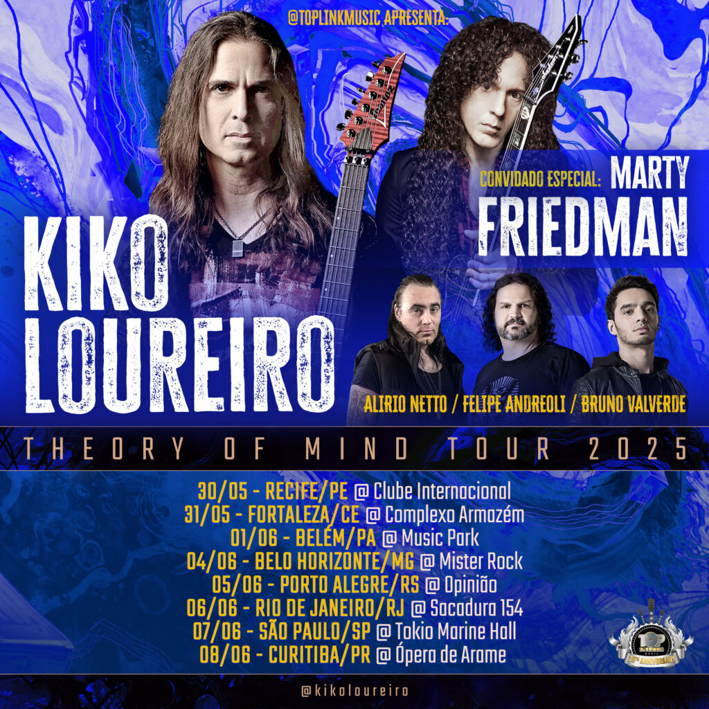 Os guitarristas Kiko Loureiro e Marty Friedman, ex-integrantes do Megadeth, anunciaram uma turnê conjunta pelo Brasil em junho. O encontro inédito entre os músicos promete uma celebração da carreira de ambos, incluindo momentos especiais no repertório. Algo que todos os guitarristas e amantes da guitarra não podem perder. Será um show inédito, que dificilmente vai acontecer de novo.