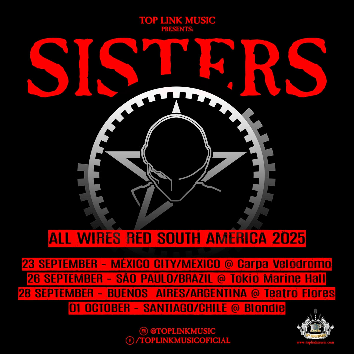 * 28 de setembro – Buenos Aires, Argentina @ Teatro Flores (domingo) – Ingressos: https://www.passline.com/eventos/the-sisters-of-mercy-all-wires-red-south-america-2025