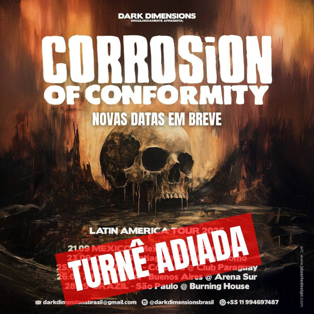 Informamos que, infelizmente, a turnê da banda americana Corrosion of Conformity pela América Latina foi adiada. O motivo principal é um conflito de dados em razão de uma proposta irrecusável para realizar mais de 20 apresentações como banda de suporte nas turnês de Judas Priest e Alice Cooper pelos Estados Unidos.