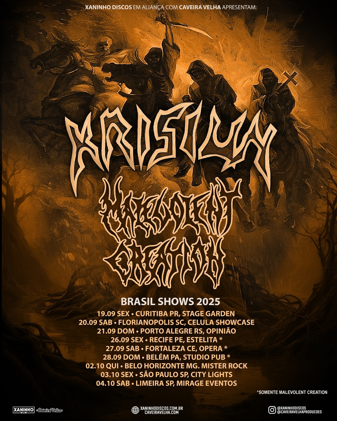 Novamente juntos, Krisiun e Malevolent Creation fazem shows em Belo Horizonte/MG, dia 2/10, no Mister, Rock; em São Paulo/SP, dia 3/10, no City Lights, e dia 4/10 no interior paulista, em Limeira, no Mirage Eventos.