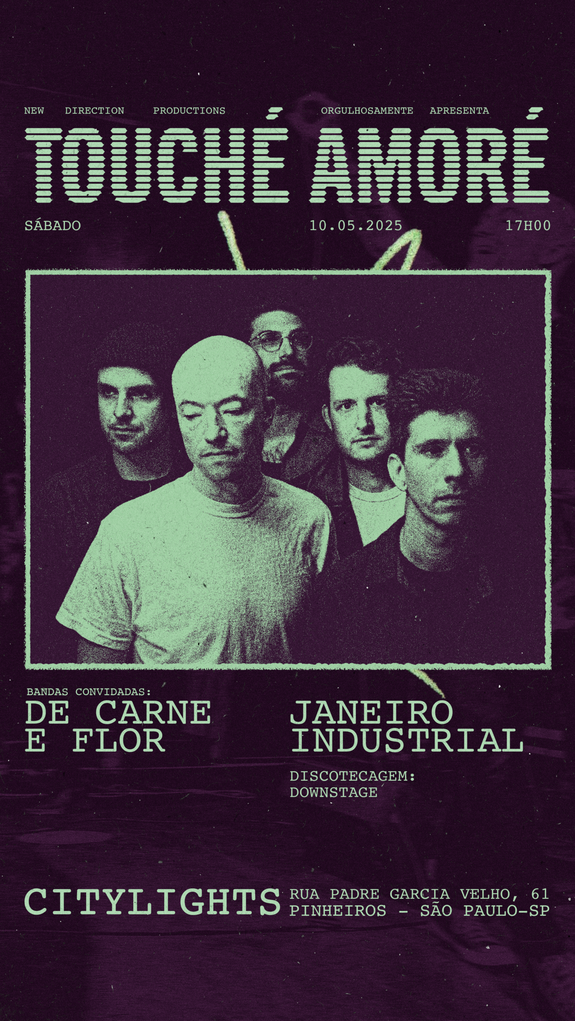 As bandas nacionais De Carne e Flor e Janeiro Industrial fazem os shows de abertura para o Touché Amoré.