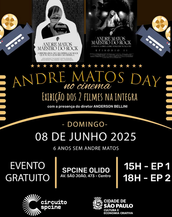 A programação está dividida em duas sessões no cinema da Olido. O primeiro episódio, intitulado “Andre Matos – Maestro do Rock – Episódio 1”, será exibido às 15h00, seguido pelo segundo episódio, “Andre Matos – Maestro do Rock – Episódio 2”, às 18h00. Cada sessão promete levar o público a uma imersão profunda na trajetória de Andre Matos, relembrando momentos marcantes de sua carreira em bandas como Viper, Angra e Shaman, carreira solo, além de sua contribuição única para a música nacional.