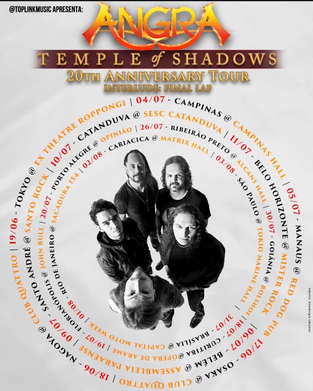 Após uma série de shows bem-sucedidos ao longo de 2024 e início de 2025, o Angra anuncia as datas finais da sua turnê comemorativa Temple of Shadows 20th Anniversary Tour – Interlude. A nova etapa da turnê inclui apresentações no Japão e em diversas cidades brasileiras, entre junho e agosto deste ano, marcando a pausa desse ciclo histórico. O Angra atualmente é formado por Rafael Bittencourt (guitarra), Felipe Andreoli (baixo), Fabio Lione (vocal), Marcelo Barbosa (guitarra) e Bruno Valverde (bateria).