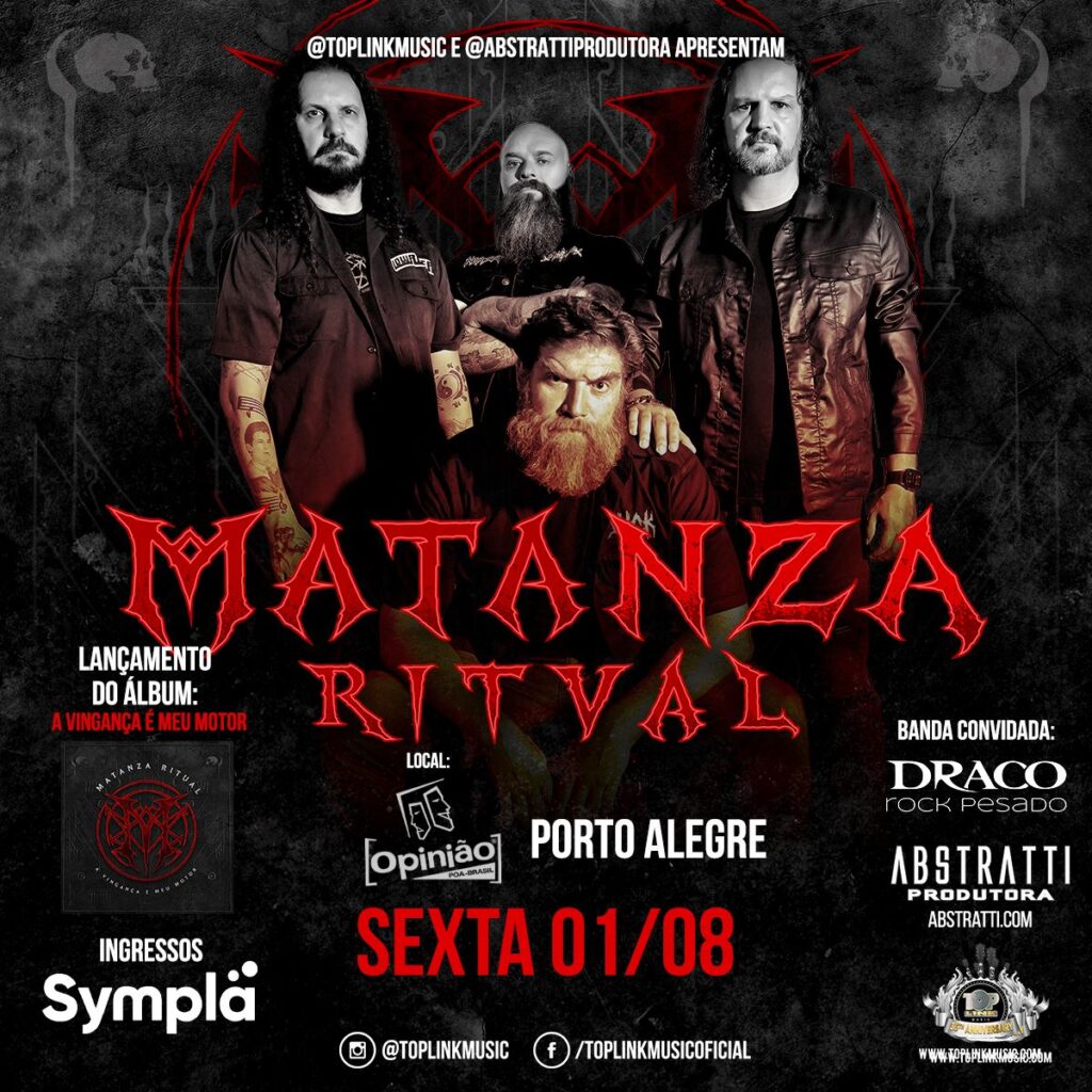 O Matanza Ritual retorna a Porto Alegre para um show muito aguardado no Opinião, no dia 1º de agosto, a partir das 18h30. A apresentação faz parte da turnê de lançamento de “A Vingança é Meu Motor”, o primeiro álbum de inéditas da banda, que vem movimentando o cenário do rock nacional desde sua estreia em março. Como banda convidada foi confirmada a participação dos porto-alegrenses do Draco Rock Pesado, formada em 2003 e com um currículo que soma diversos singles, um EP e um álbum, além de shows recheados do mais puro Rock and Roll.