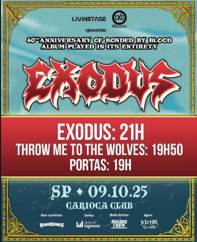 ão Paulo vai ferver no dia 9 de outubro de 2025 com um evento histórico: a banda americana Exodus, ícone do thrash metal da Bay Area, tocará inteiramente o álbum Bonded by Blood em show especial no Carioca Club, em Pinheiros. Com a realização da Livingstage e CKConcerts este evento promete ser uma experiência única, não apenas pelos riffs devastadores que marcaram o thrash metal, mas também pela oportunidade de estar frente a frente com a banda por meio de um meet and greet exclusivo.