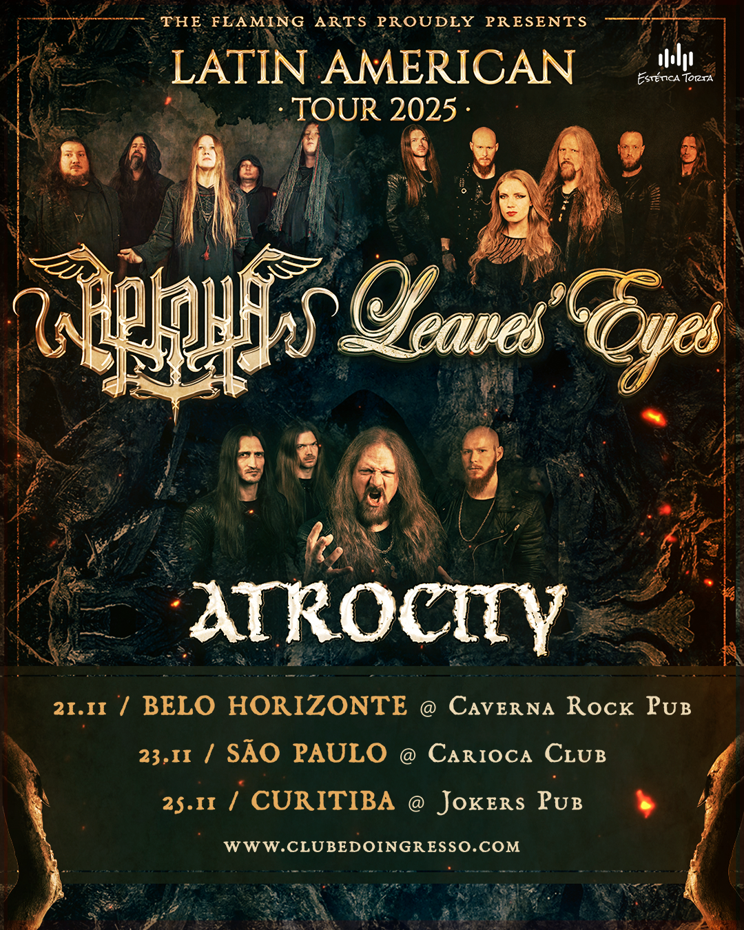 Três grandes nomes do metal europeu se unem em uma turnê histórica pelo Brasil. A banda russa Arkona, referência mundial no folk/pagan metal, retorna ao país após sete anos com seu som poderoso e letras inspiradas na mitologia eslava. Ao seu lado, os alemães do Leaves’ Eyes trazem toda a grandiosidade do symphonic metal, com vocais etéreos e arranjos épicos, enquanto o Atrocity, também da Alemanha, completa o line-up com sua sonoridade agressiva e experimental, marcada por décadas de reinvenção no cenário do death metal.