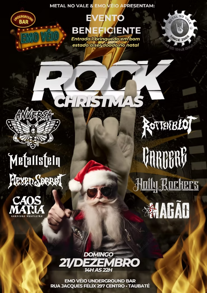 O grupo sobe ao palco do festival beneficente ‘Rock Christmas’ neste domingo, 21 de dezembro, no Emo Véio Underground Bar (@emoveio_bar), em Taubaté/SP. Além do METALLSTEIN, o cast do evento conta com as bandas Caos Mantia, Magão, Holy Rockers, Carcere, Rottenblot E Anversa. O festival une o peso do cenário extremo à solidariedade, arrecadando brinquedos para doações de Natal. Confira abaixo o cartaz e o serviço completo para mais informações: