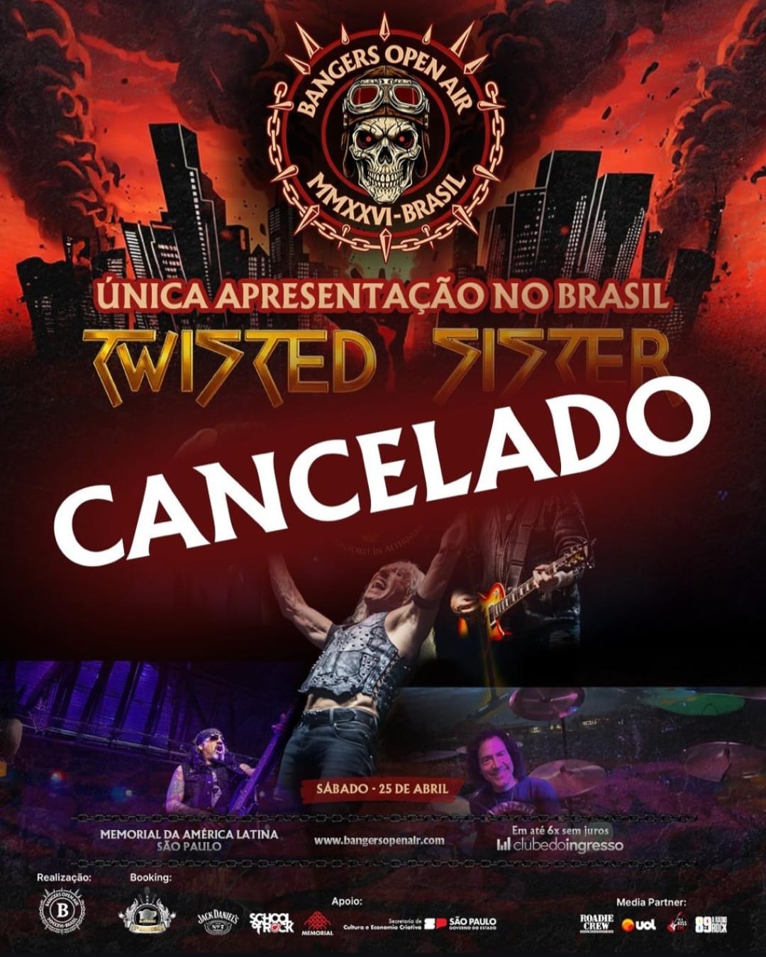 A banda Twisted Sister cancelou todos os shows previstos para a comemoração de seus 50 anos de carreira. As apresentações começariam em 25 de abril, em São Paulo, e seguiriam ao longo do verão. As informações foram divulgadas pelo perfil oficial do festival Bangers Open Air no Instagram (@bangersopenair).